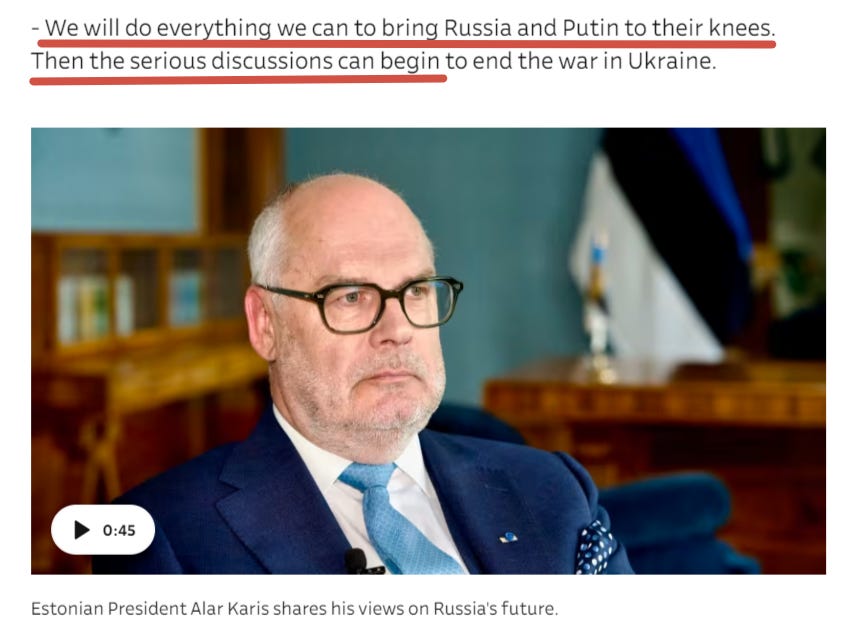 Meanwhile the Estonian president Alar Karis stated that the West “must bring Putin and Russia to their knees” before any serious negotiations can ensue: