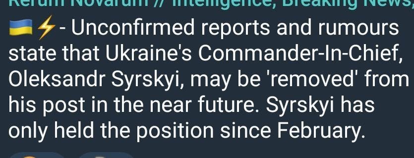 If there’s even a hint of truth to the above, I’d far likelier wager the real reason being Zelensky’s need to crop the command a tad in order to rein in growing prospects of military coup.
