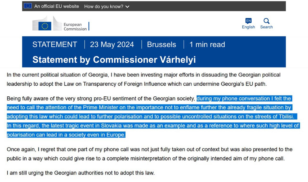 Commissioner Várhelyi: “Being fully aware of the very strong pro-EU sentiment of the Georgian society, during my phone conversation I felt the need to call the attention of the Prime Minister on the importance not to enflame further the already fragile situation by adopting this law which could lead to further polarisation and to possible uncontrolled situations on the streets of Tbilisi. In this regard, the latest tragic event in Slovakia was made as an example and as a reference to where such high level of polarisation can lead in a society even in Europe. Once again, I regret that one part of my phone call was not just fully taken out of context but was also presented to the public in a way which could give rise to a complete misinterpretation of the originally intended aim of my phone call.”