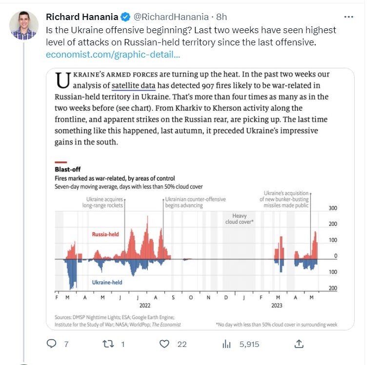 All this brings us to the topic of the “coming offensive”. I use air-quotes because I’m personally still skeptical that Ukraine can even launch the fabled offensive, let alone achieve anything with it, owing to the fact that Russia has devastated all their staging areas, set their ammunition and logistics back by months. Of course, it’s always impossible to know with 100% certainty, and there may well be more reserves than I give them credit for.
