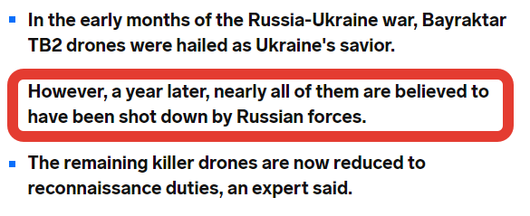 Remember when Oryx and his fake list claimed only a small handful were “confirmed shot down”, and anyone claiming that the entire fleet of Ukraine’s 70-90+ TB2 drones were shot down would be called crazy? How times have changed…
