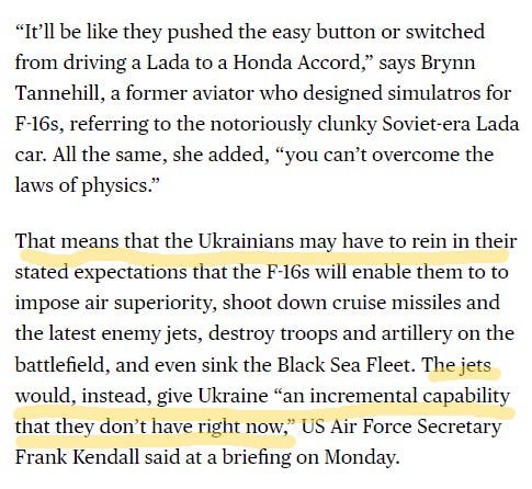 Suddenly, after all that bluster, the F-16s in fact will only offer an “incremental ability” for Ukraine.