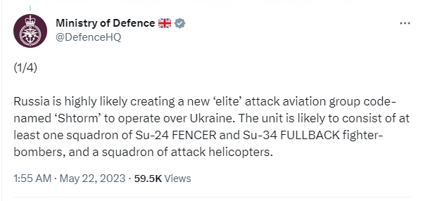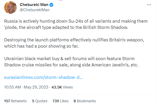 This even includes Defense Minister Reznikov being blamed by angry Ukrainian channels for inadvertently giving up the secret location of the Storm-Shadow-armed Su-24s when he recently posted a boasting message showing an Su-24 photo with a Storm Shadow attached under its wings. The problem is, the message contained the emblem of the 7th tactical aviation wing stationed at Starokonstantinov in the Khmelnitsky region. So, did he give away the position of the secret British base or did Russia already know its location?