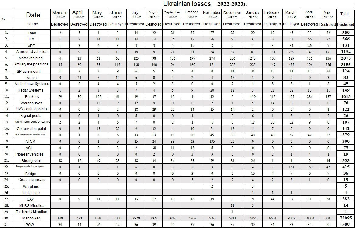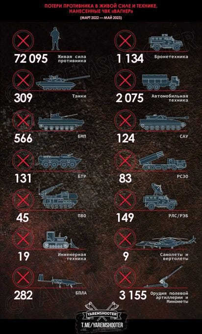 And speaking of Prigozhin, while Wagner has officially vacated Bakhmut and handed it over to the nominal Russian forces, they have released some interesting new audit reports. This includes the final tally of Ukrainian forces and equipment destroyed which Wagner meticulously totted up for each monthly period, and it’s a doozy: