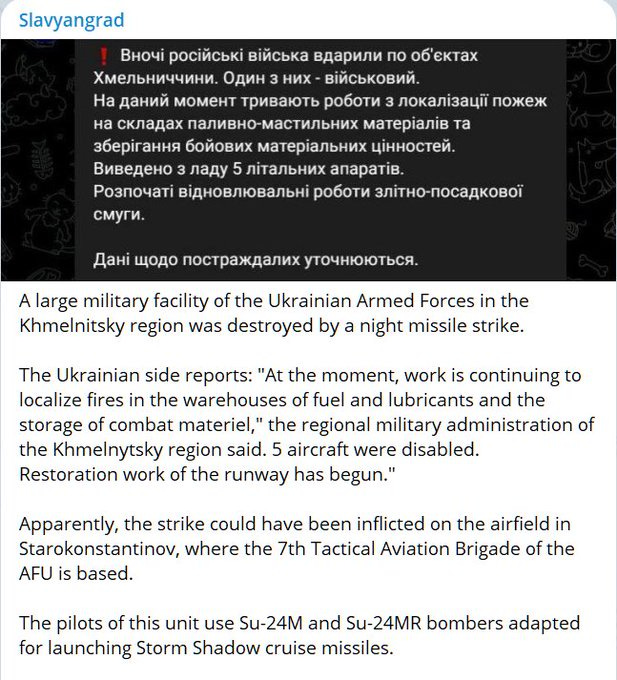 Now, as of last night’s strikes, there are reports of extremely crippling damage being done to critical AFU areas. The most damaging are the reports that Russian missiles obliterated an airport in Khmelnitsky region, where the five Su-24s which were outfitted with British Storm Shadows were housed: