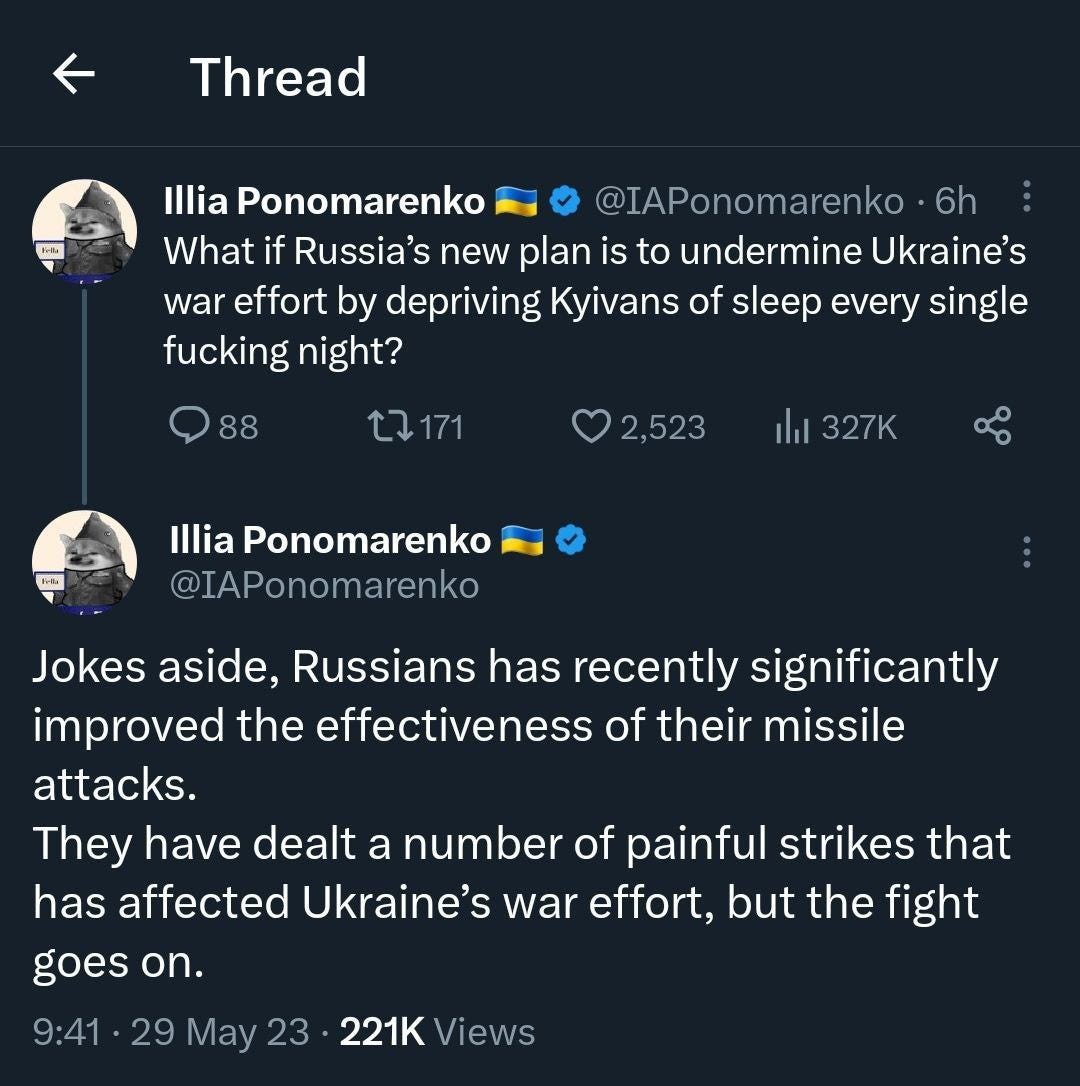 Other prominent Ukrainian figures are acknowledging that major setbacks were incurred by the new Russian strikes. For instance, Illia Ponomarenko, the loudmouth whose Nazi-apologist article I had just covered in the last report, wrote the following: