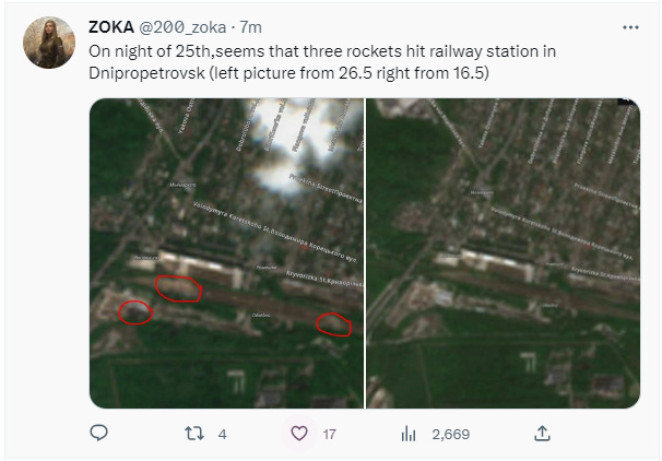 And satellite photos of a railway station strike on Dnipropetrovsk where Ukraine was offloading gear. I believe there are clearer photos out there but this screenshot with the description was more convenient: