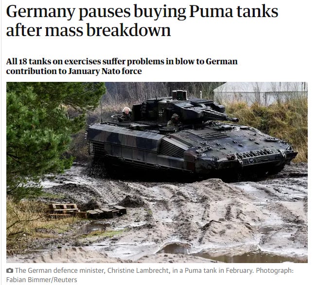 All 18 out of 18 Pumas broke down during exercises in one way or another. To be honest, as others have speculated in the past, such a mind-boggling decrepitude can only possibly be explained by intentional sabotage. Just like some have hypothesized about the Pentagon leaks, one can only wonder if some anti-imperialist patriot went to town on those Strykers. But given the fact that their problems appear all over the place, rather than from something that can disable them uniformly and en masse, like an adulterated oil/fuel supply, it does seem to point to a simple, unprecedented quality issue.
