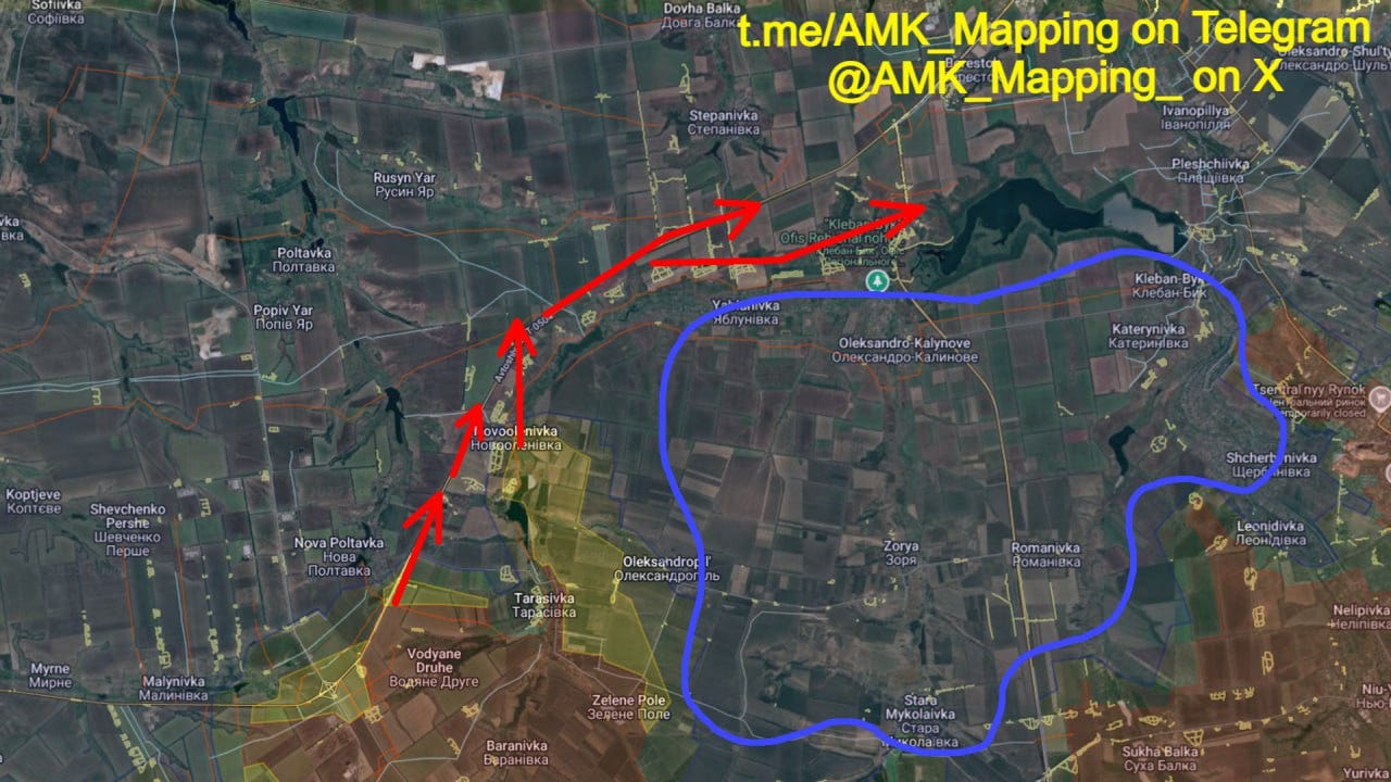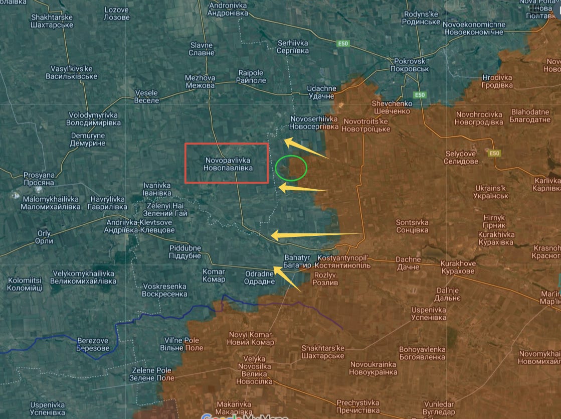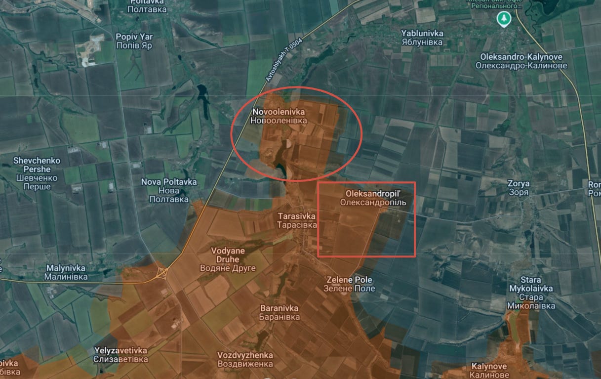 In fact, that's the problem for Ukraine here. This line is aimed at containing an offensive from Toretsk and Avdiivka, which would explain why Russia has been pushing so hard to break Ukrainian lines from Vozdyvzhenka and the Pokrovsk - Kostyantynivka highway. However, after months of efforts and preparatory measures, the localised breakthrough they needed has finally been achieved at Novoolenivka, while supporting advances secured various areas around Malynivka, Nova Poltavka and Yelyzavetivka.