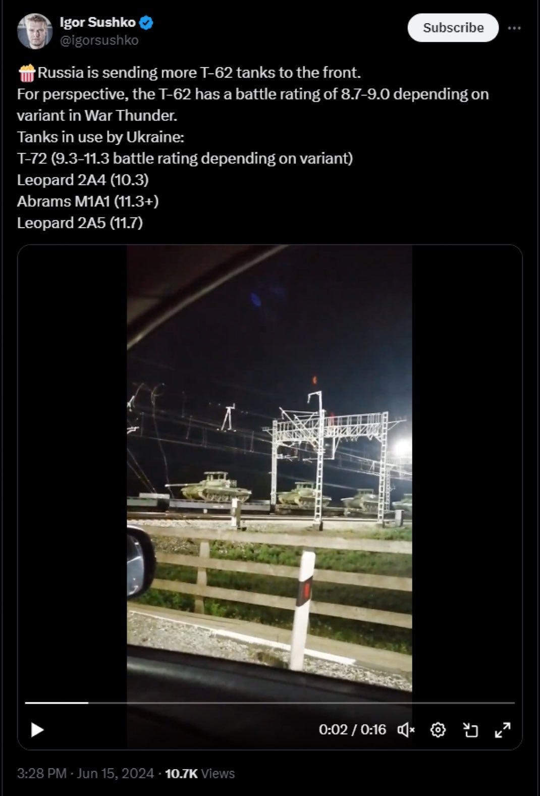 Just two reports ago I had quipped about how war is not decided by WarThunder forum spergs but rather by the specific usage of a given combat vehicle to its best strengths. Now the pro-UA commentariat has proven they do in fact faultily judge the war based on—literally—WarThunder stats. Here’s one of the pro-UA side’s top influencers and social media propaganda peddlers criticizing a recent video of a new echelon of Russian T-62M tanks heading to the front by pointing out that their WarThunder stats are low compared to Western tanks:
