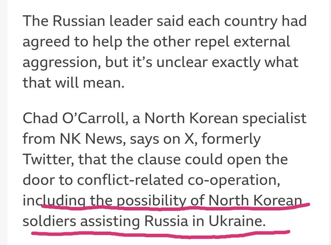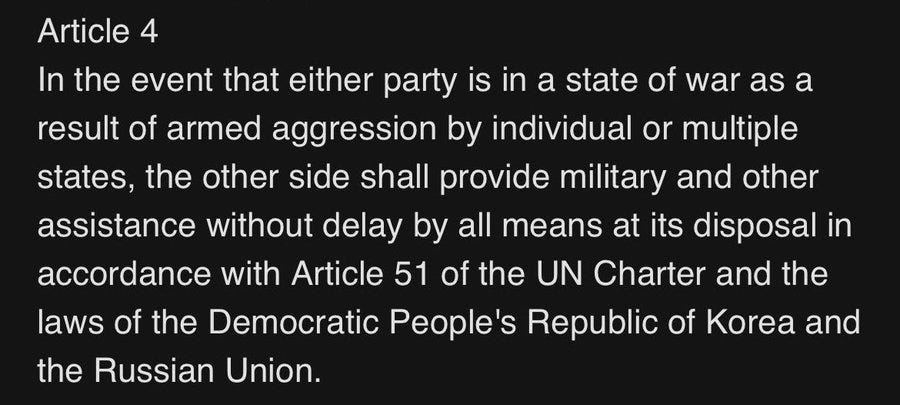 Beyond the perfunctory pledges for cooperation in various civil fields, Russia and NK intend to construct a new road bridge at their border to better facilitate inter-state travel, as well as the big one: a ‘comprehensive strategic partnership’ for assistance in the event of aggression. This sounds one step shy of a full military alliance.