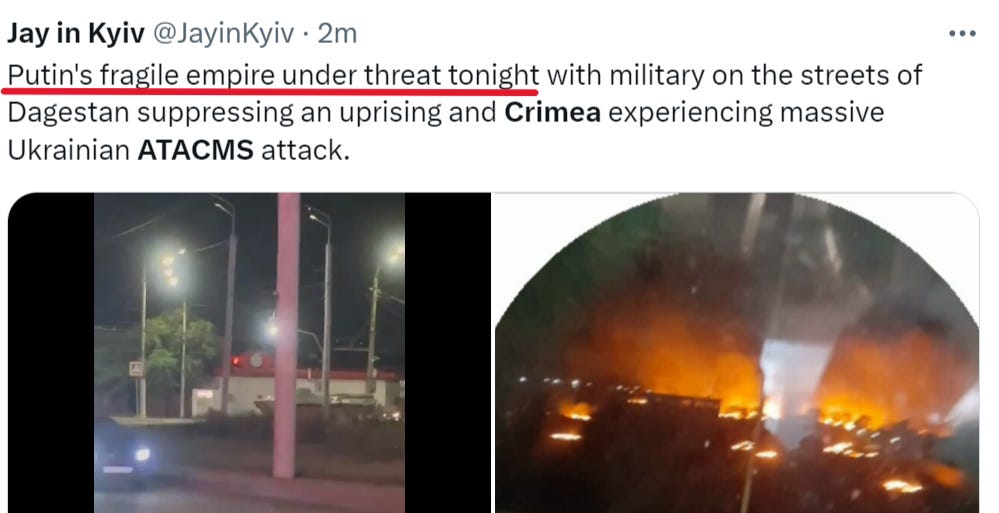 In accordance with that, today Ukraine launched a coordinated ATACMs strike on beachgoers in Sevastopol, reportedly injuring ~150+ or more, and killing half a dozen, though that death toll may rise as per usual. At the same time, a jihadi terrorist cell was activated in Dagestan, which went on a killing spree targeting Orthodox Christian churches, as well as a Synagogue, with one of the Orthodox priests reportedly having his throat slit. Also, an attack occurred on the Abkhazia border with multiple dead as well. Keep in mind this is just days after an ISIS cell staged an attack in a Rostov prison, though fortunately the only victims there were the jihadis themselves.