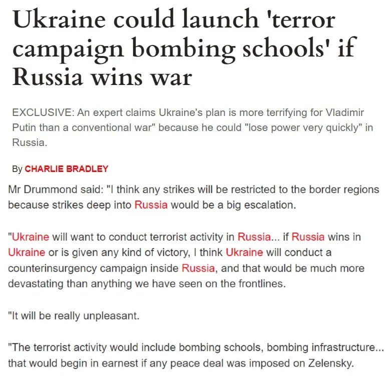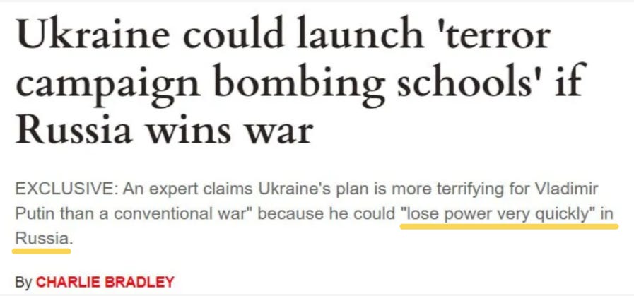 Is it any surprise then that, in perfect accordance with the stated terror goal above, top pro-UA figures are voicing a uniform propaganda line about the effect the latest strikes will have against Putin and Russia? Just take a look for yourself, again from the earlier article which predicts the terror campaign—carefully read the underlined portion: