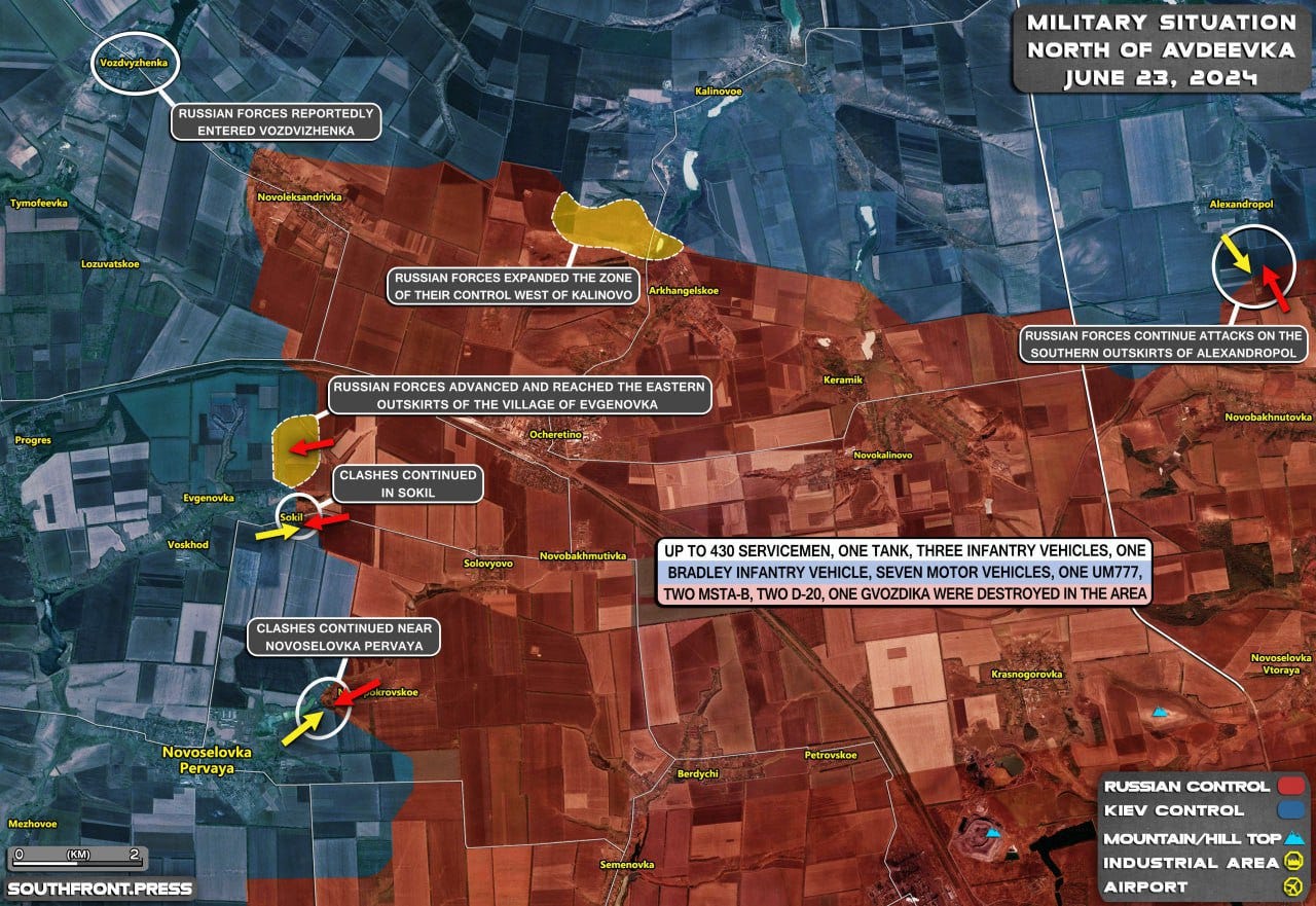 Russian forces continue making gains on nearly every front, visualized by the handy SouthFront maps below. The most significant are the central pushes toward the Toretsk axis: