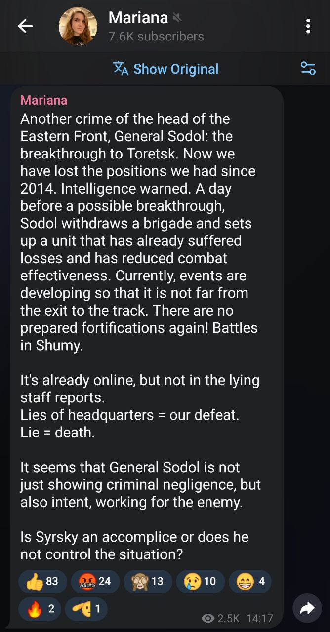 This remains the most important axis because it’s another area long fortified and leads right to the key stronghold of Konstantinovka, which itself is the final gateway to the Kramatorsk agglomerate. Even Ukrainian People’s Deputy Mariana Bezuhla was forced to issue an angry condemnation of the general staff for the losses here: