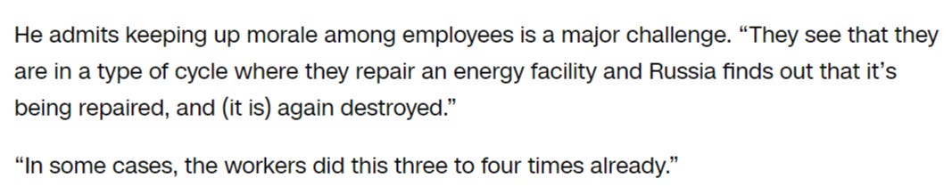 “If we don’t restore the existing the damaged plants, if we don’t improve the interconnector capacity for input, if we don’t build these distributed generators, at least in some places… then people will have power for less than four hours per day,” says Dmytro Sakharuk, executive director of DTEK, Ukraine’s largest private energy company.