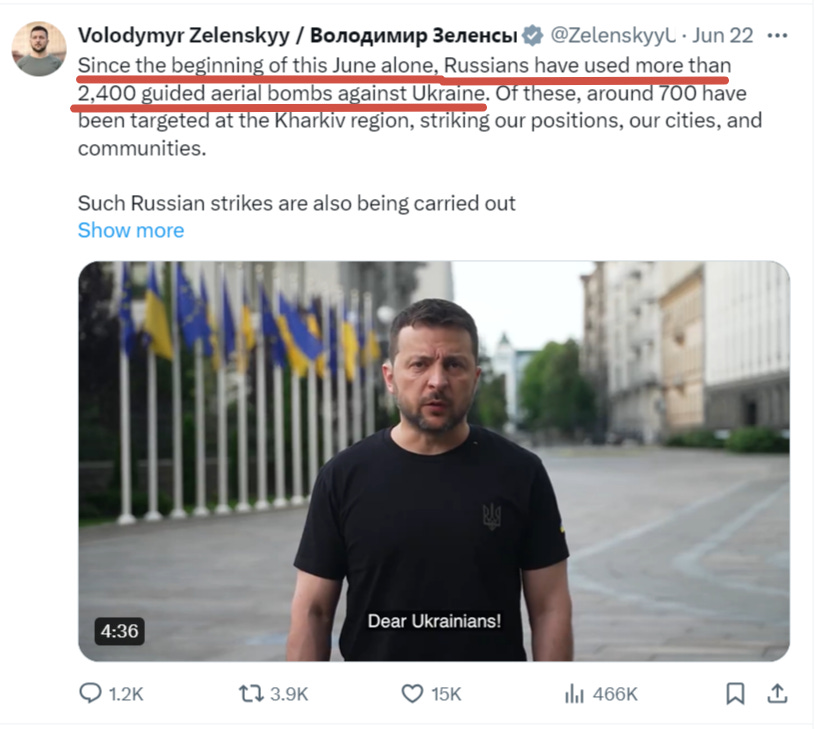 How many AFU soldiers on average are eliminated by each one of those bombs, do you think? Multiply that number by 2,400, then double or triple that figure to allot for casualties from artillery and other means.