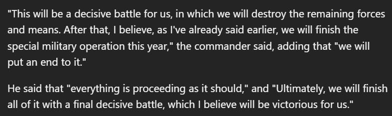 Right now there are rumors that Syrsky is being forced to put together another “offensive” for this fall, and channels like Rezident claim sources indicate reserves are being built up for this. The reasons are several-fold, but they include the U.S. mandate to launch a successful offensive right in time for the U.S. election to give Biden a final propaganda boost.