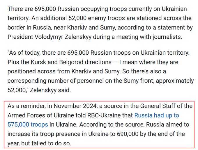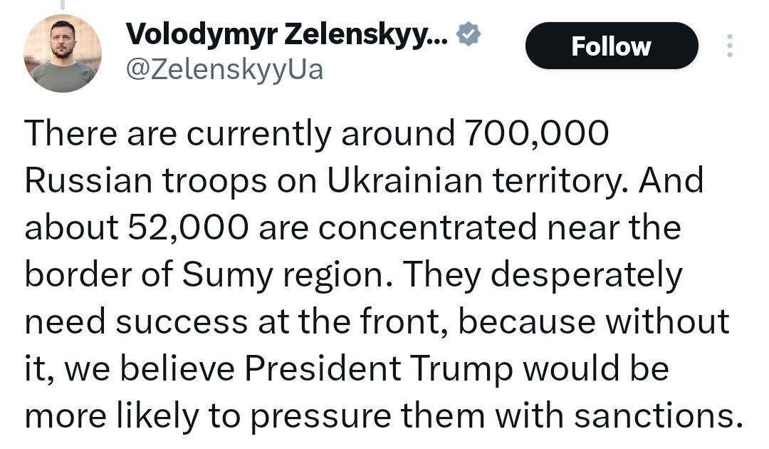 While Ukraine continues to bleed men, Zelensky has given us an update on Russian manpower, now claiming there are roughly 700k Russian troops in Ukraine, with an additional 50k just over the Sumy and Kharkov borders: