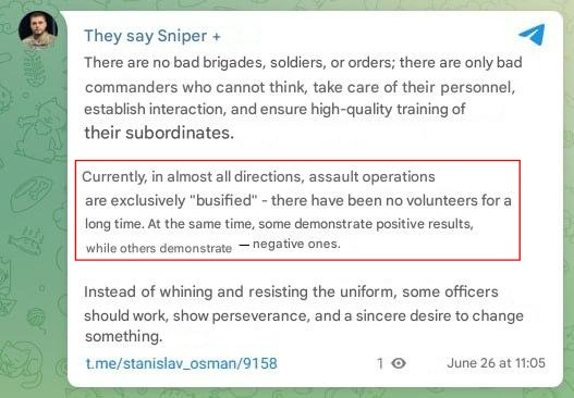Ukrainian officers have issued dire new calls of alarm about the front. Aidar platoon commander Stanislav Bunyatov writes that in almost all combat directions, assault operations are exclusively carried out by ‘busified’ people—that is, Ukrainians who have been press-ganged by the mobilizers, rather than motivated volunteers: