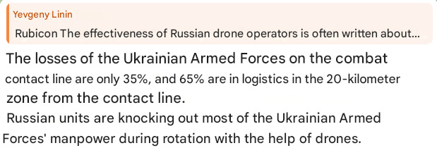 Thus, according to these figures, by far the largest losses Ukrainian troops are experiencing are in the operational zone 3-20km behind the contact line; in essence, this is the logistics zone, highlighting that logistics is the most vulnerable segment of the armed forces because it has to constantly stay mobile, running back and forth from the contact line—whether it be rotations, resupplies, etc.