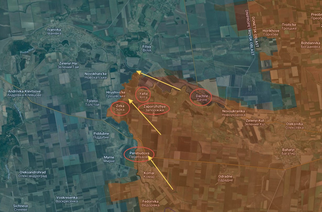 Last time we left off with Russian forces having just liberated Komar and Perebudova. Now they have captured several settlements north of that, from Zaporozhye, Yalta, to Zirka along the Mokry Yaly river.