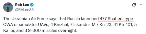 Last night, Russia also launched one of the largest strikes of the war, when you count total assets used. The missile count was relatively low, but the drones numbered nearly 500 Shaheds and other decoys in total, which is likely a record for single day usage: