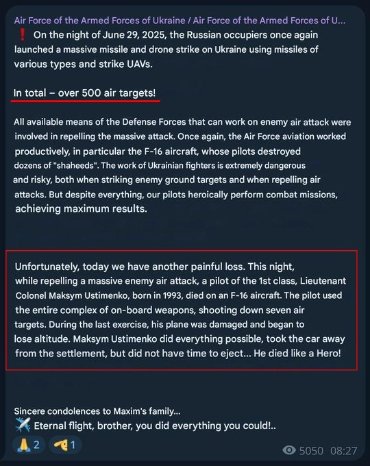 This now makes multiple F-16s shot down by Geran drones. The problem appears to be they are incapable of locking onto the drone as it has a very small IR signature, so they are being forced to engage the drone at extremely close ranges, which peppers the F-16 with shrapnel after the drone explodes.