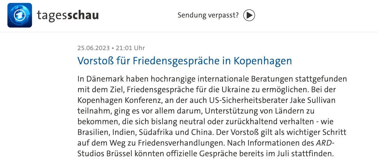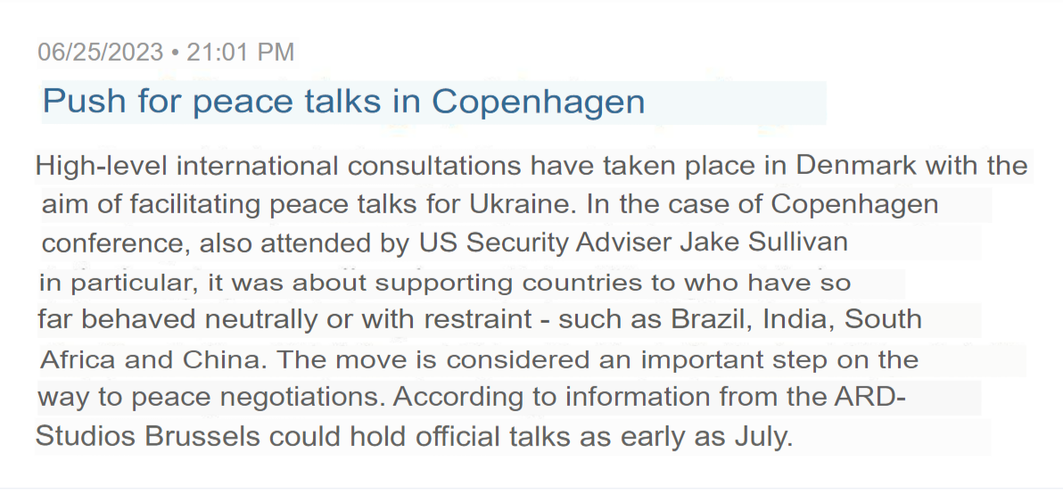 But since obtaining fighter jets is not realistic in the near term future, the dialogue continues shifting to one of negotiations. German broadcaster ARD stated that a secret international meeting on Ukraine was held in Copenhagen days ago, on June 24th, where diplomats of various Western countries met with BRICs representatives in an effort to figure out a way to convince Russia on how to settle the conflict peacefully. ARD concludes that official negotiations on resolving the conflict could occur as early as July: