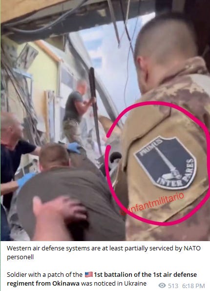 It’s claimed to be the patch for the 1st Battalion of the American 1st AD regiment of Okinawa, which implies that American specialists are manning the NATO air defenses in Ukraine. Though it could be the ‘instructors’.