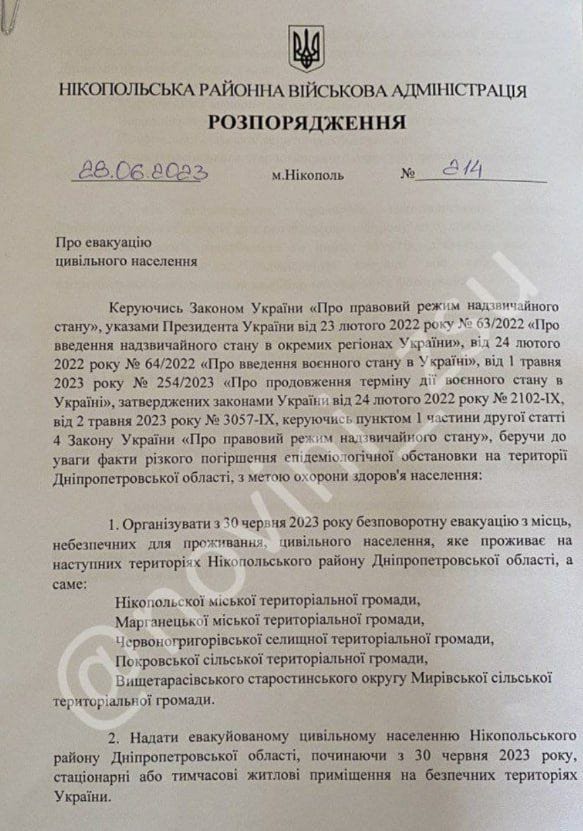 These evacuations were reportedly ordered in the Nikopol area opposite the ZNPP on the basis of a radiological event: