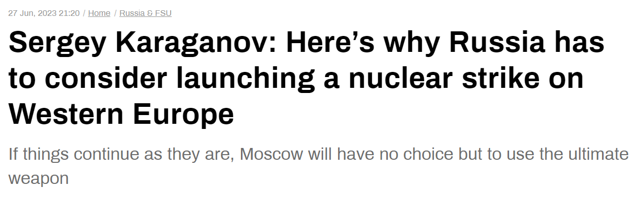 It’s one of the reasons that some Russian hardliners are increasingly advocating for Russia to use its nukes before they lose all deterrence potential. You’ll recall that last time I posted the Karaganov-penned article making waves, where he advocated for using nukes. Now he’s written a new follow up article where he cuts the dithering and makes it even more clear: if things continue escalating, Russia should consider nuking not Ukraine, but Europe.