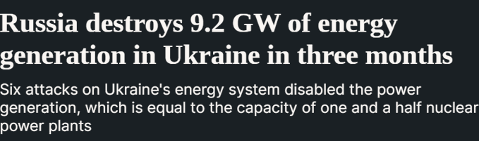 Amid all the drama on the various fronts, Ukraine's loss of electrical generating capacity perhaps doesn't get as much attention as it deserves. But it could be a huge factor in determining the war's outcome. Note that already Ukraine can't keep their most important cities operating. Industry and homes alike are going dark. That desperate situation was brought about with relatively few Russian missiles, and no doubt what remains of Ukraine's electrical grid is equally vulnerable. If that goes, then it's back to rubbing two sticks together to make fire, figuratively speaking.