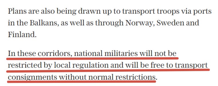 What this boils down to is the perennial rolling out of the old ‘military Schengen’ plan, where they envision how to facilitate NATO movement through countries during time of war without any administrative red-tape restrictions: