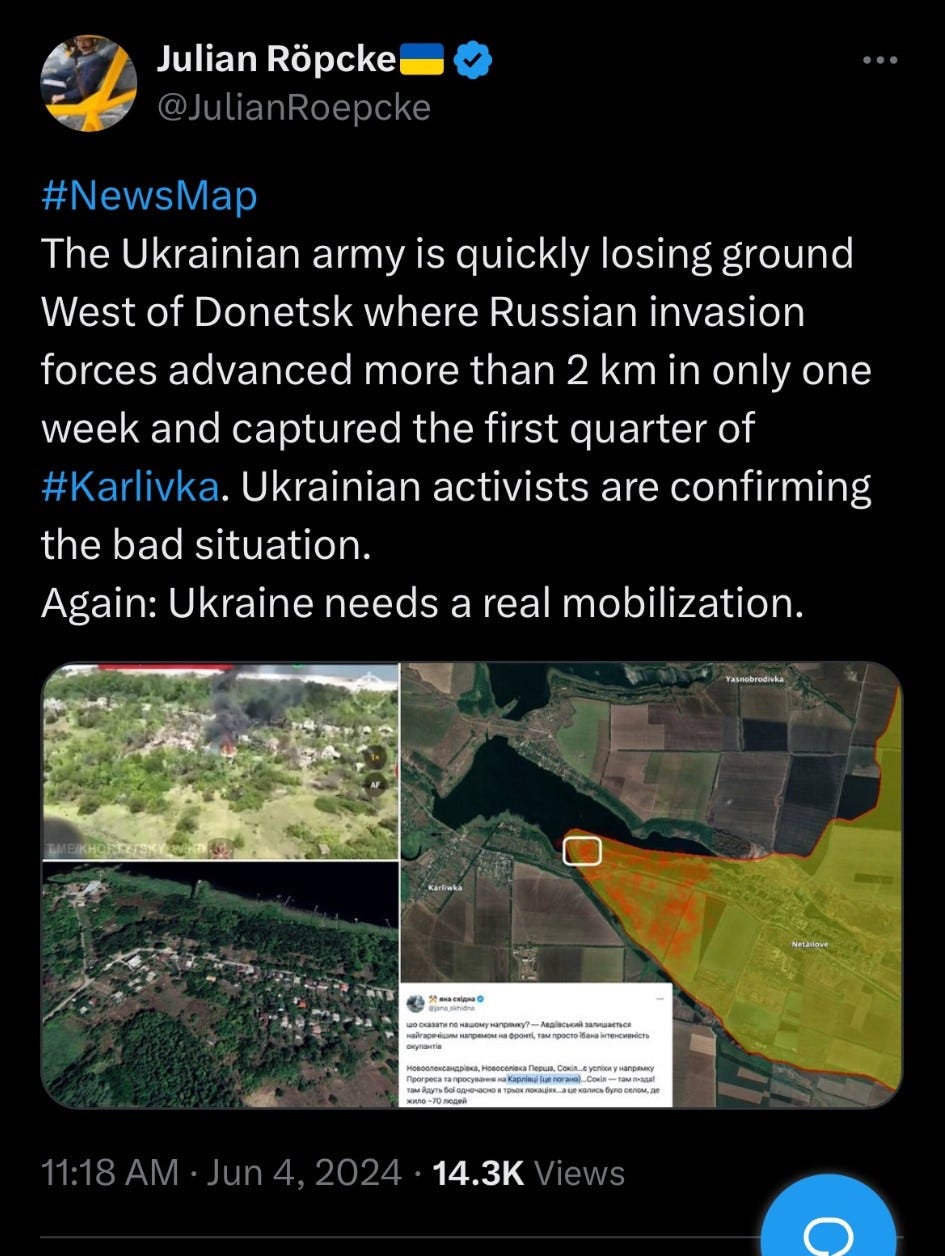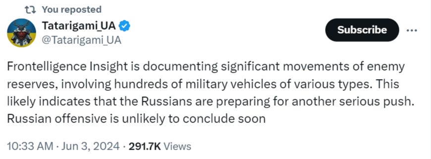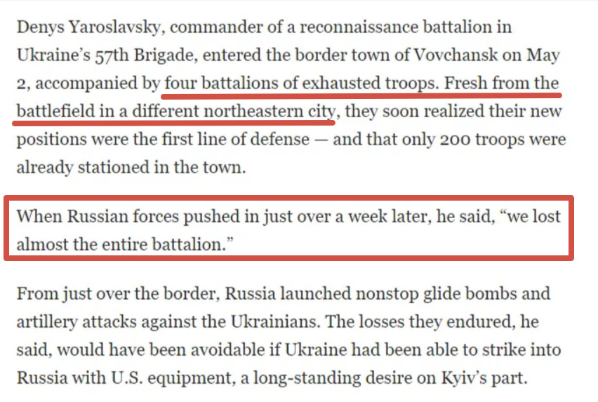 There was a video of a claimed Russian soldier speaking of alleged heavy losses on the Russian side that Ukrainians were passing around. But he speaks of a company or two suffering heavy 300 casualties in the opening breach on Volchansk: he specifically says the 200s were low, but many suffered 300 (injuries). And as I said, he was referring to the opening days of the assault which are always fraught with losses, like when those mass armor pushes first began to flood Avdeevka last October. Once Russians reached the current positions and dug in, the few opening losses diminished to very little. Anyway, no one says Russia isn’t suffering losses—but it doesn’t compare to Ukrainian commanders outright admitting entire battalions are being wiped out like in the WaPo piece above.