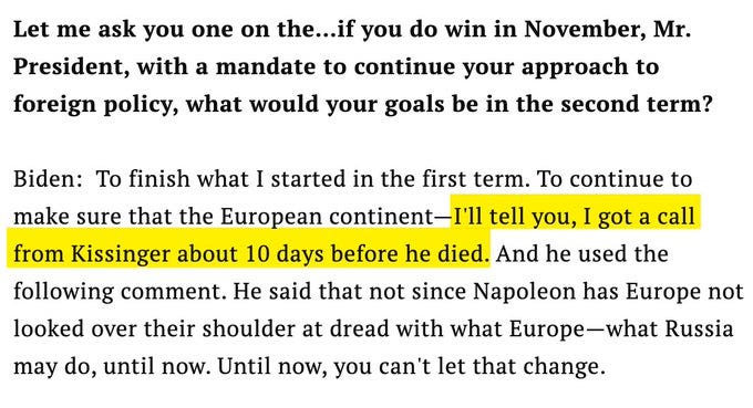 In a new Time magazine interview, Biden says that Kissinger called him 10 days before he died, and that his final words to Biden were a premonition of Russia’s threatening resurgence: