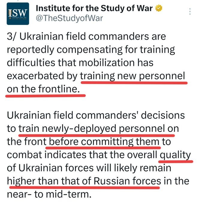 The Ukrainian soldier problem is getting so bad that ISW now tries to repackage the AFU’s inability to even train its troops as some sort of ‘advantage’ over Russia: