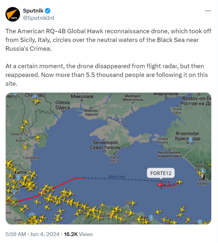 After several new persistent rumors that Russia intends to take action against NATO’s Black Sea surveillance drones, today an interestingly ‘anomalous’ incident occurred. The American RQ-4B Global Hawk was said to have disappeared from radars, spurring headlines that it was shot down, but soon after reappeared—seemingly indicating it had turned off its transponders at a certain point near Crimea: