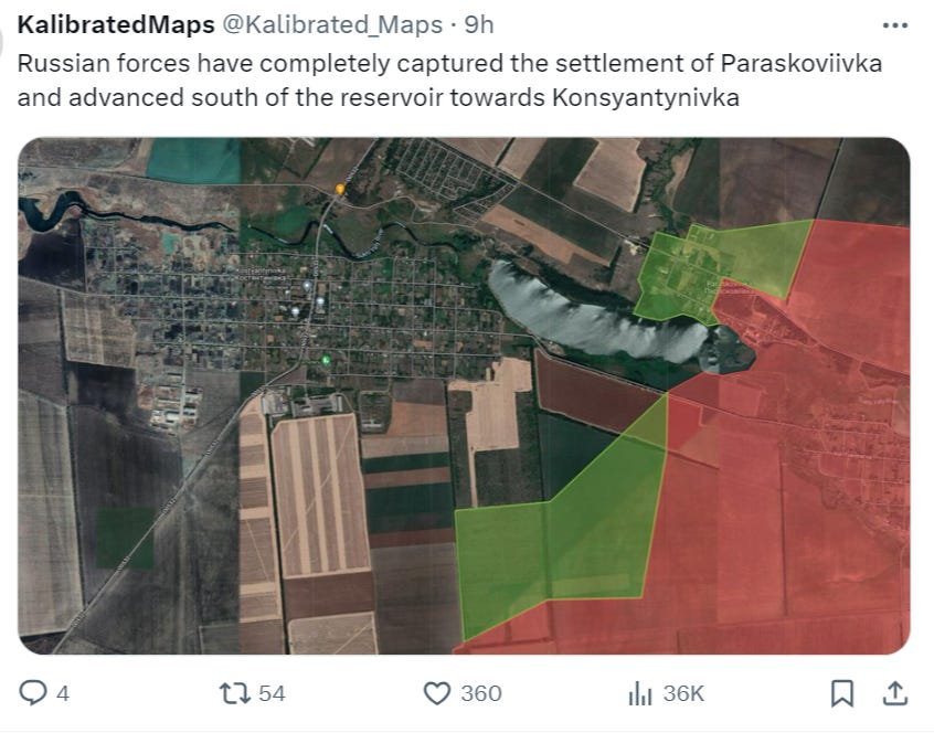 As for granularly direct battlefield updates, Russian forces continue to inch forward, capturing positions on a variety of fronts in the Donetsk region and elsewhere, with Andreevka and Paraskovievka said to have been totally captured.