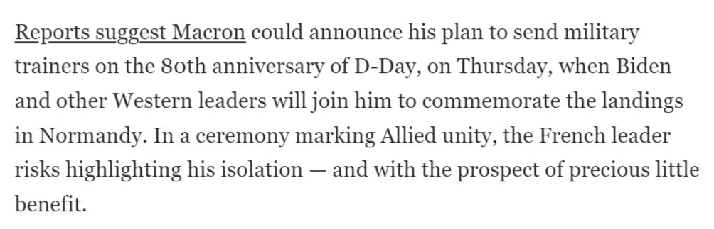 Now at the same time the pressure of another major pivot point mounts as reports claim that Macron may be set to announce the French ‘trainer’ troops deployment to Ukraine on the Normandy anniversary celebrations on June 6th: