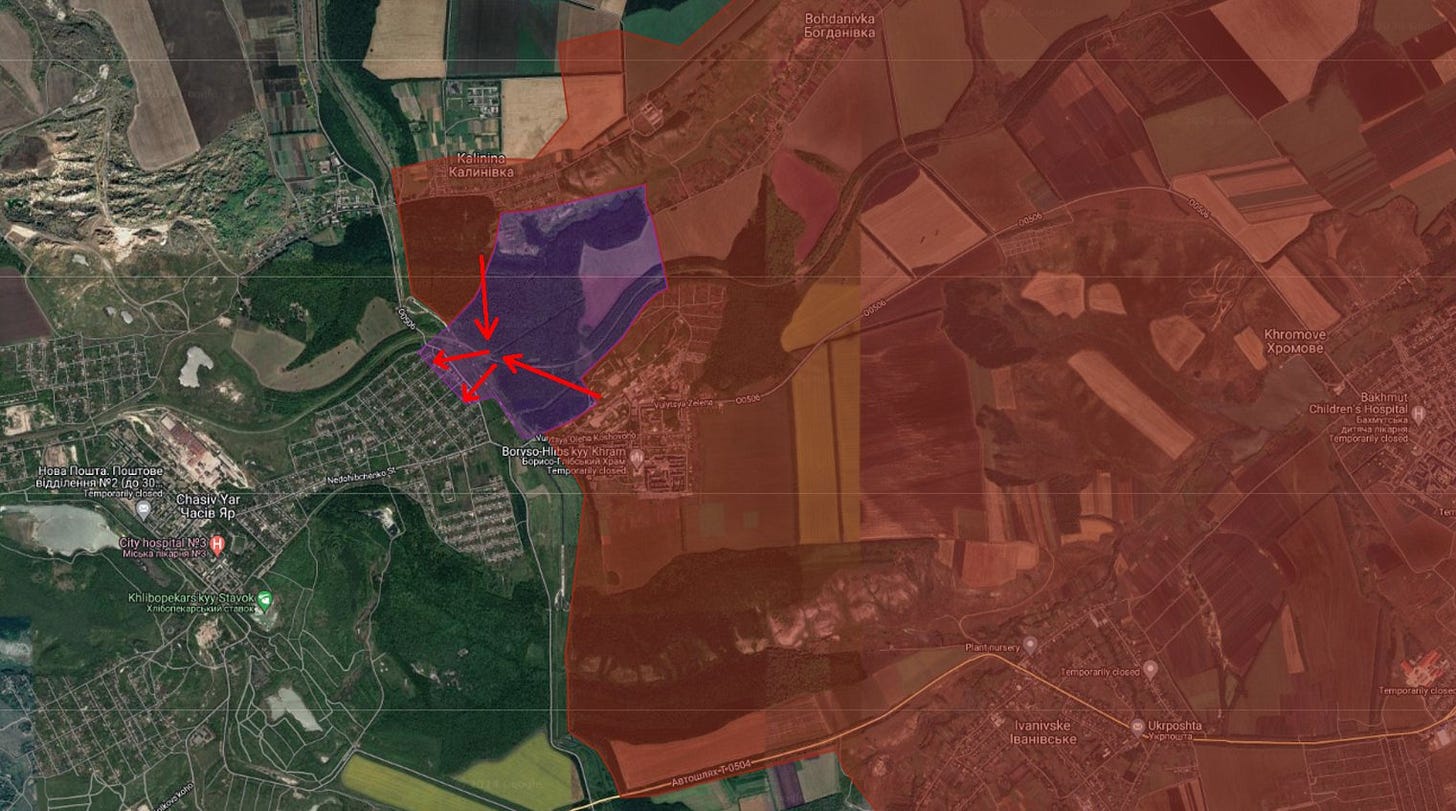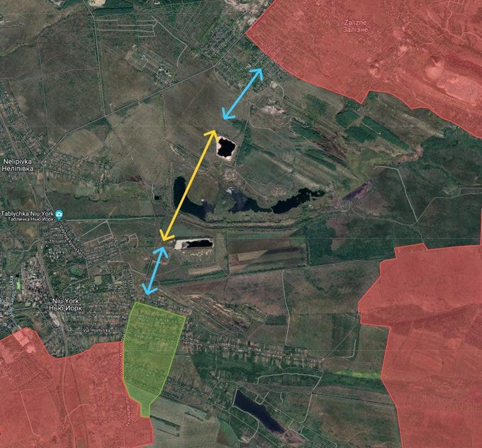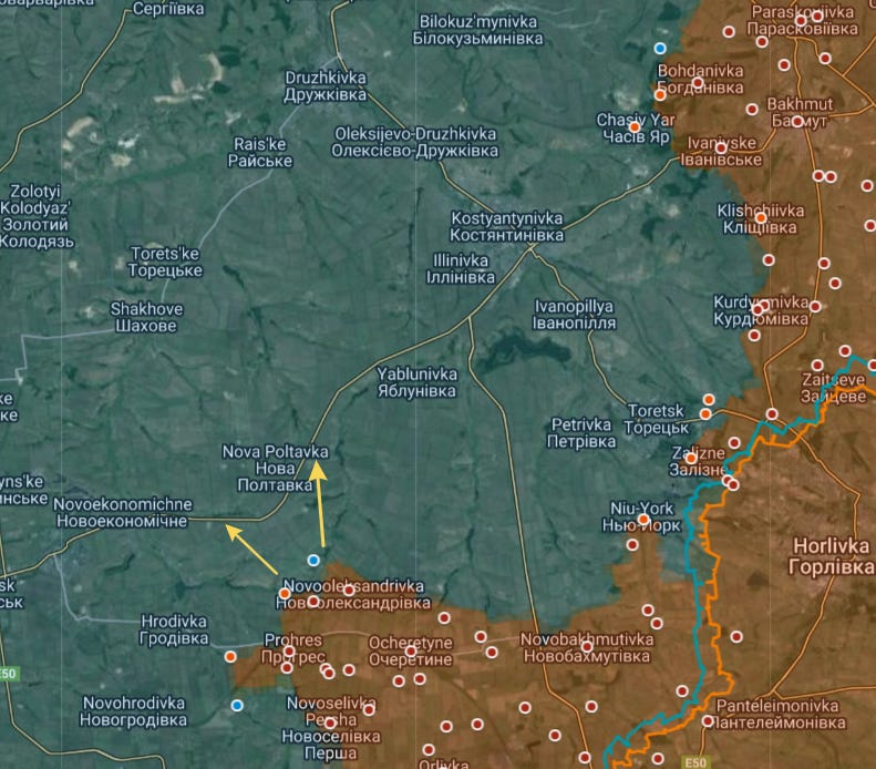 In the west of Progress, near Ochertino, Russian forces advanced as well. What’s clear is that a salient will eventually break off toward the main supply route in the north to cut off Konstantinovka like so: