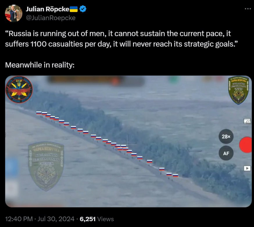 Interestingly, the above statement from the 47th commander points to another ongoing narrative, which I’ll share as a brief digression from the Die Welt article. This is the sudden underscoring from several pro-UA sources that Russia is winning because of some new “tactic”, which turns out to be nothing more than the ‘death by a thousand cuts’ multi-vectored pressure we’ve been writing about here for almost a year and a half.