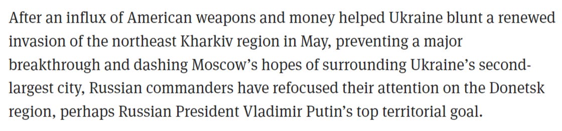As you can see, there is a clear divergence between what the pro-Ukraine faction states publicly and what is privately acknowledged. Publicly, the narrative is that Kharkov is a “big victory” for the AFU because it stopped some kind of mythical Russian invasion force dead in its tracks. I roundly refuted this in the last mailbag, emphasizing that it was obvious to any half-decent analyst the Kharkov incursion was nothing more than a fixing action to strip away units from the main assault in Donbass.