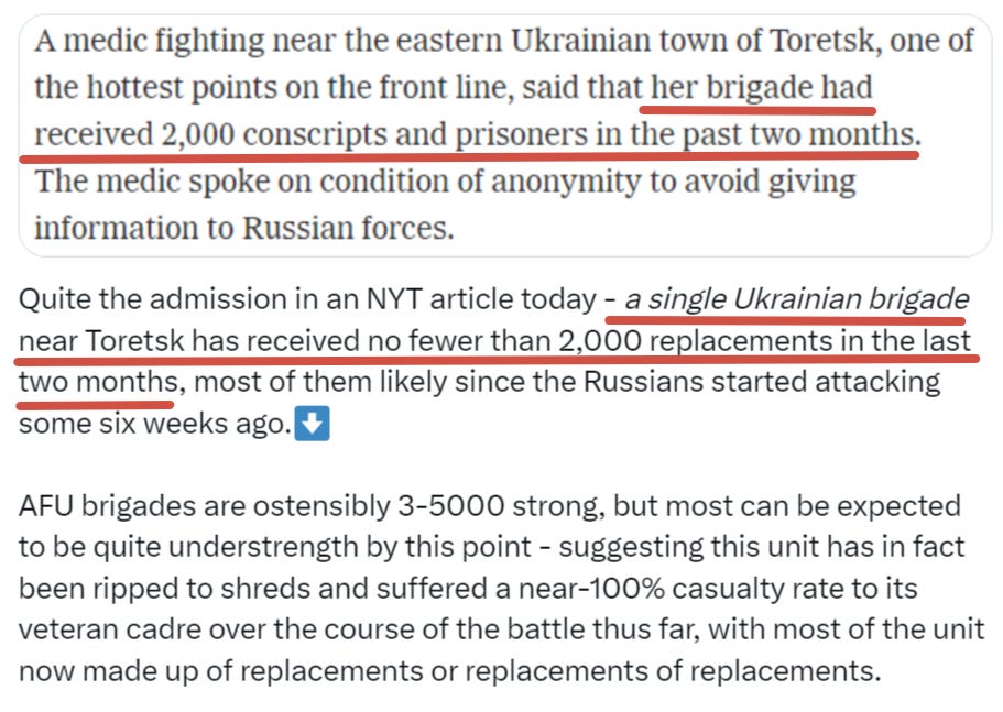 Armchair Warlord reports on X that the latest NYT article reported a Ukrainian brigade in the collapsing Toretsk direction got 2000 reinforcements in the past two months, which presumably indicates their losses: