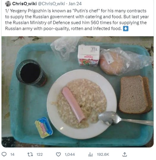 So, Prigozhin’s companies were paid a massive several billion USD equivalent for their various services, which included Prigozhin’s ‘Concord’ catering services that according to some provided substandard rotten food to the Russian army. Here’s a thread detailing some of it: