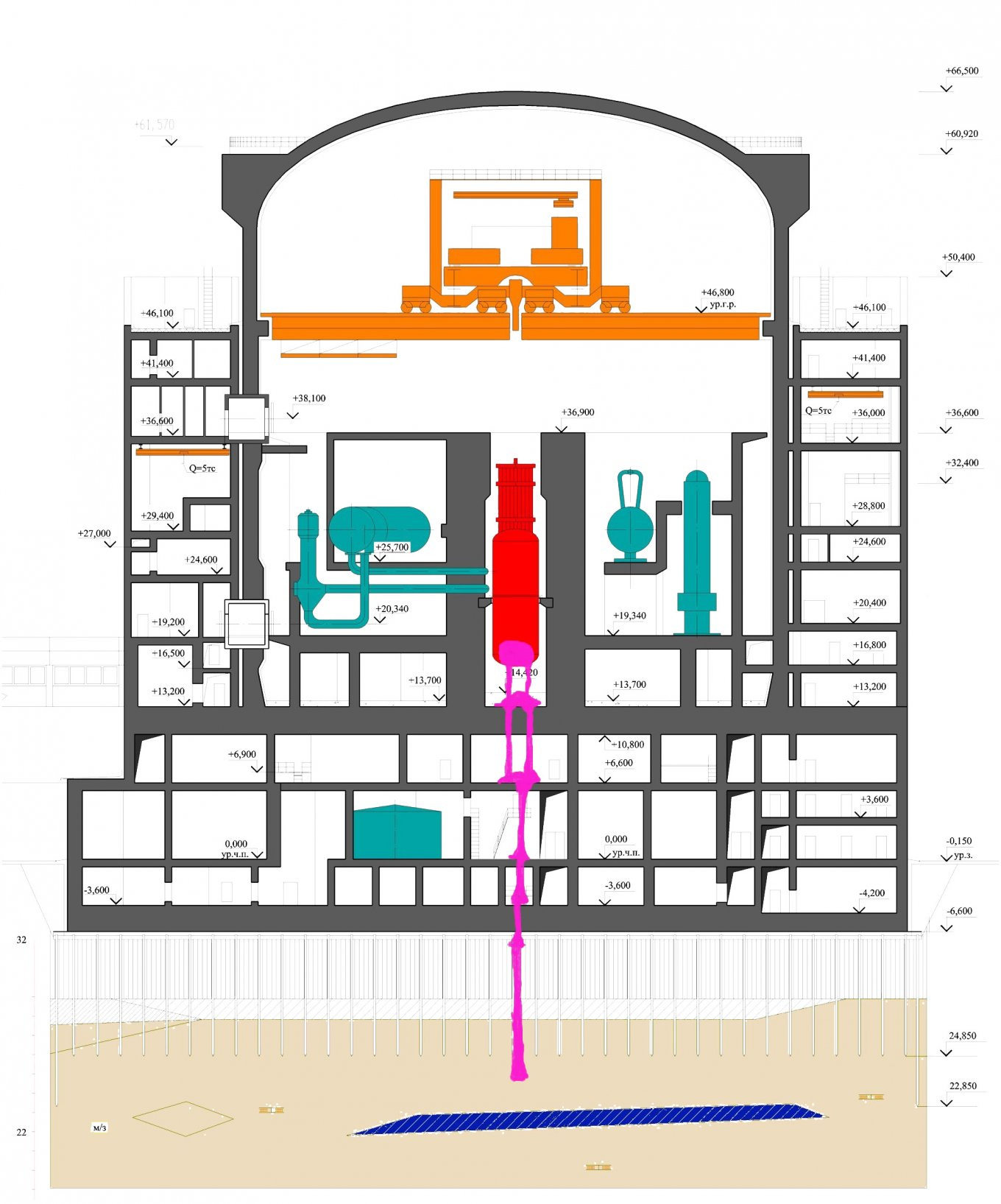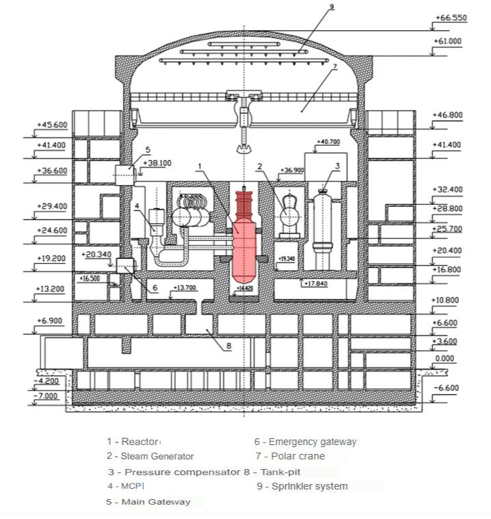 But recall the first part: the type of reactor used in ZNPP is considered ‘much safer’ than the Chernobyl reactor, owing to the fact that the pressure vessel itself is much smaller in the center of the large containment building, which has a height of 50 meters to the ceiling, a diameter of 45m and a wall thickness of 1.5m.