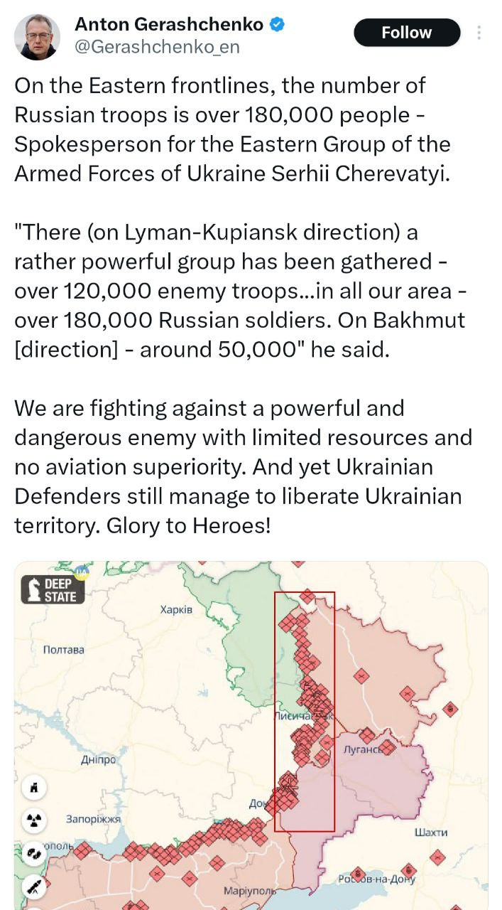 Ukrainian spokesman for the eastern grouping Serhiy Cherevaty also confirmed these facts, stating that a massive grouping 180k Russian forces are concentrated on the Kremennaya-Kharkov front: