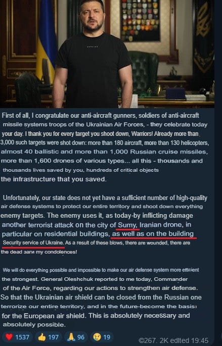 Russian Geran drones struck an SBU HQ in Sumy, which Ukraine tried to lie about. But then Zelensky released a statement admitting it: