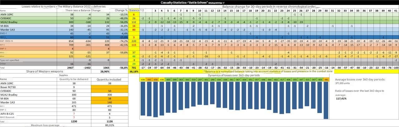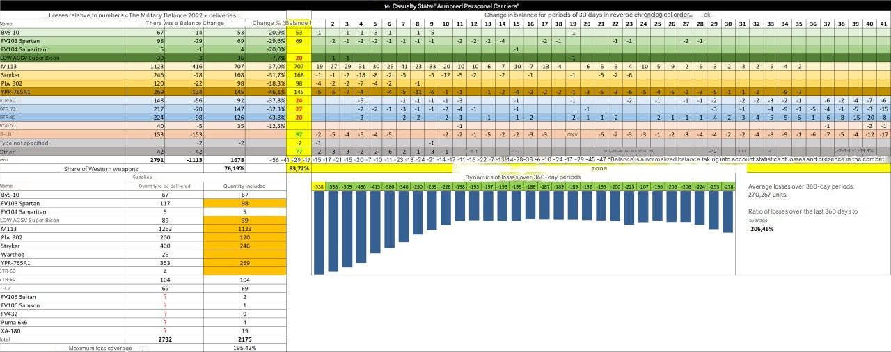 As can be seen a bit more than half of the 300 Bradleys have been destroyed, though Ukraine may retain around 1,000+ total IFVs, the bulk of which are BMP-1s and 2s.