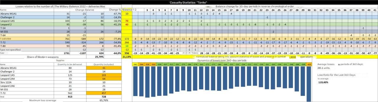 According to this estimate, Ukraine would have about 624 total tanks remaining, while Russia reportedly fields somewhere in the 1,200 - 1,500 range at any given time, with constant replenishment from the thousands more in storage, and the ~300 yearly new T-90Ms being manufactured. Ukraine, on the other hand, is not receiving any new ones that we know of, and thus any losses continue plummeting its number of total tanks.